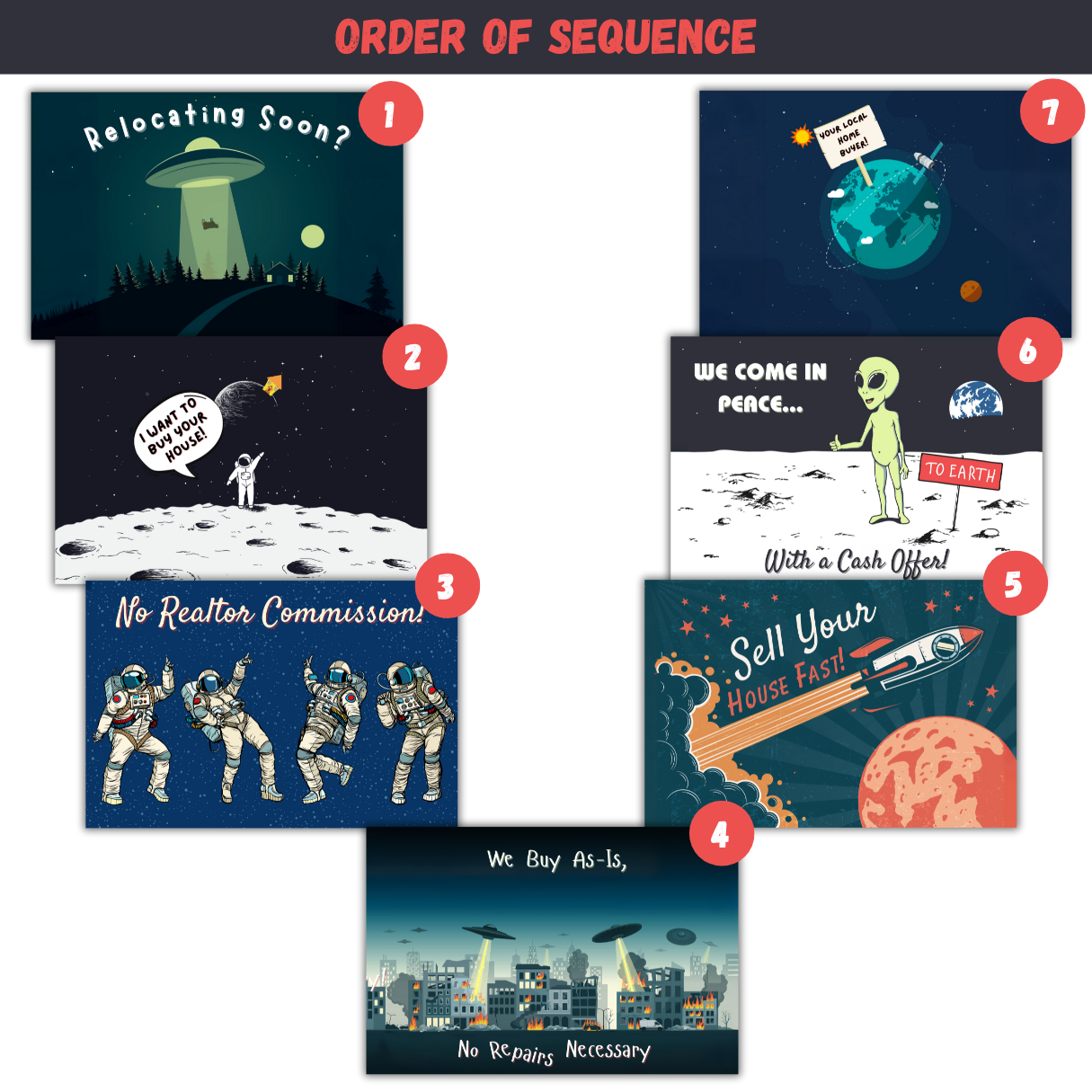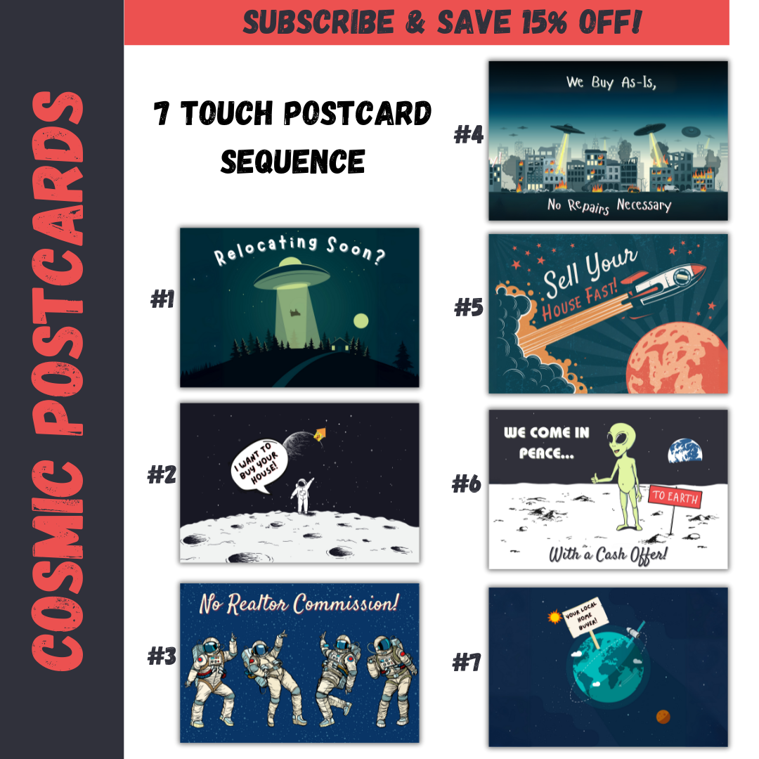 Introducing our Cosmic 7-Touch Postcard Sequence – the ultimate marketing tool for real estate investors targeting motivated sellers. With eye-catching, space-themed designs and personalized handwritten messaging, this sequence speaks directly to sellers at every stage of their decision-making process.